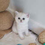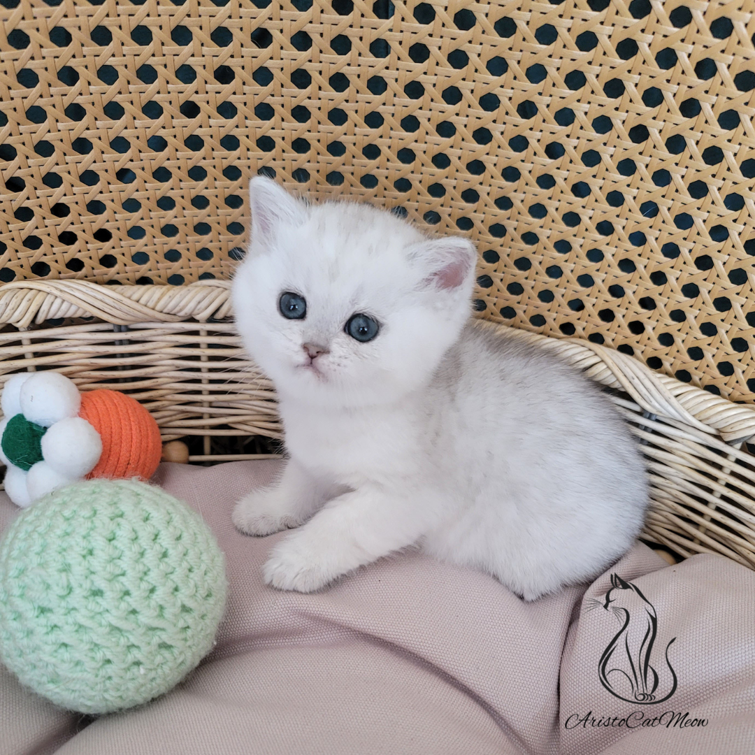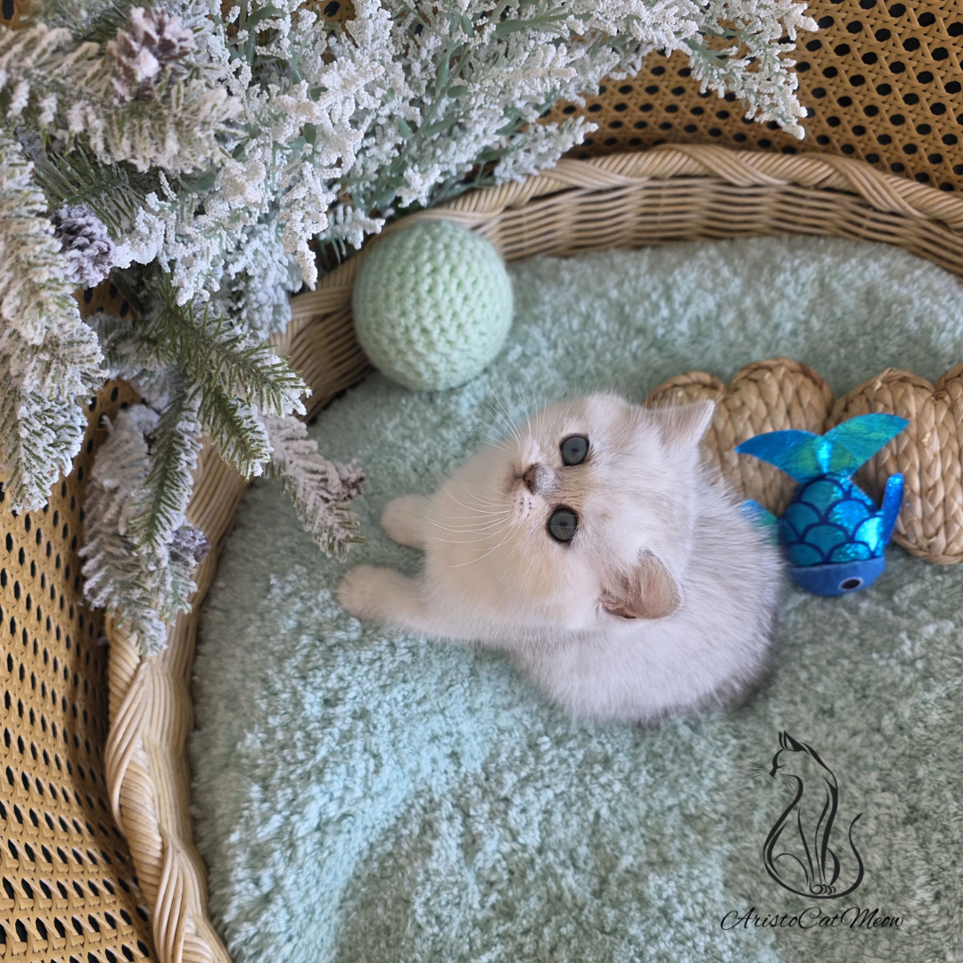 Affectionate British shorthair kitten girl with a luxurious smoky coat and stunning emerald-green eyes.